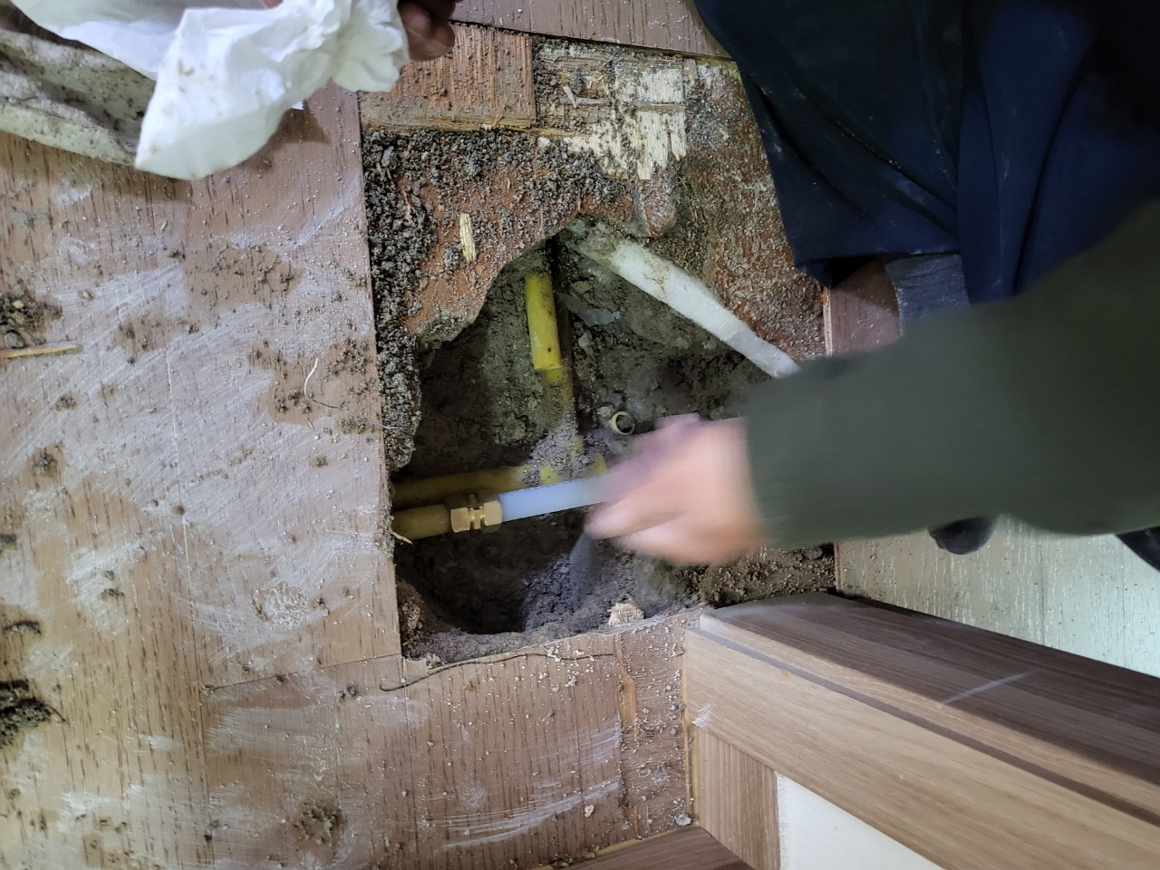 공압으로 배관의 물을 제거하고 기본 압력을 투입하여 청음식 누수탐지를 합니다. 정확한 탐지 이번에 소 20CM 내의 범위로 정확하게 탐지하고 진행하였습니다. 이것이 예가 종합 설비의 경험한 기술력입니다! 온수와 직수 2라인이 있죠. 온수에 문제가 있는 부분으로 작업하기 좋은 부분이었습니다.
