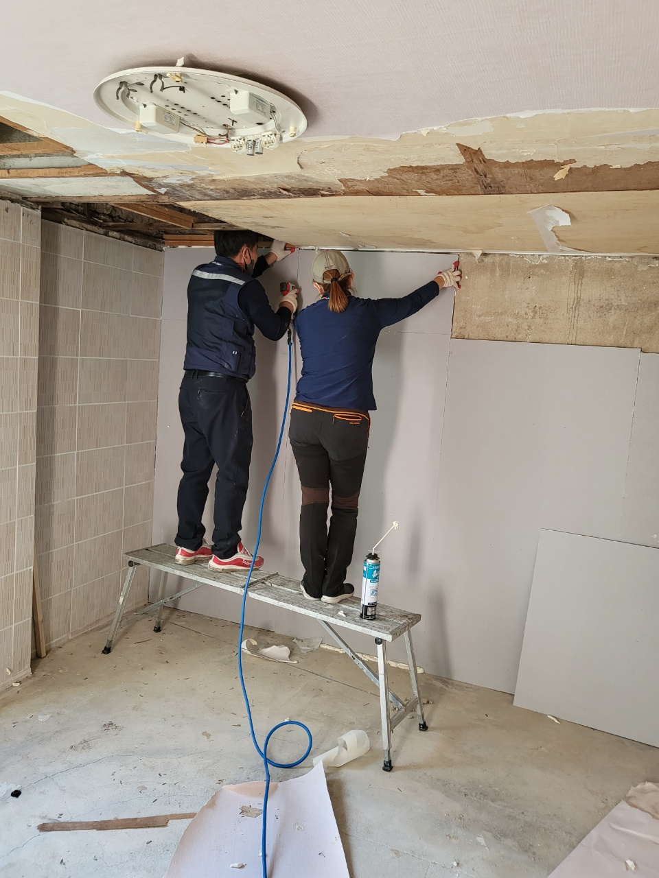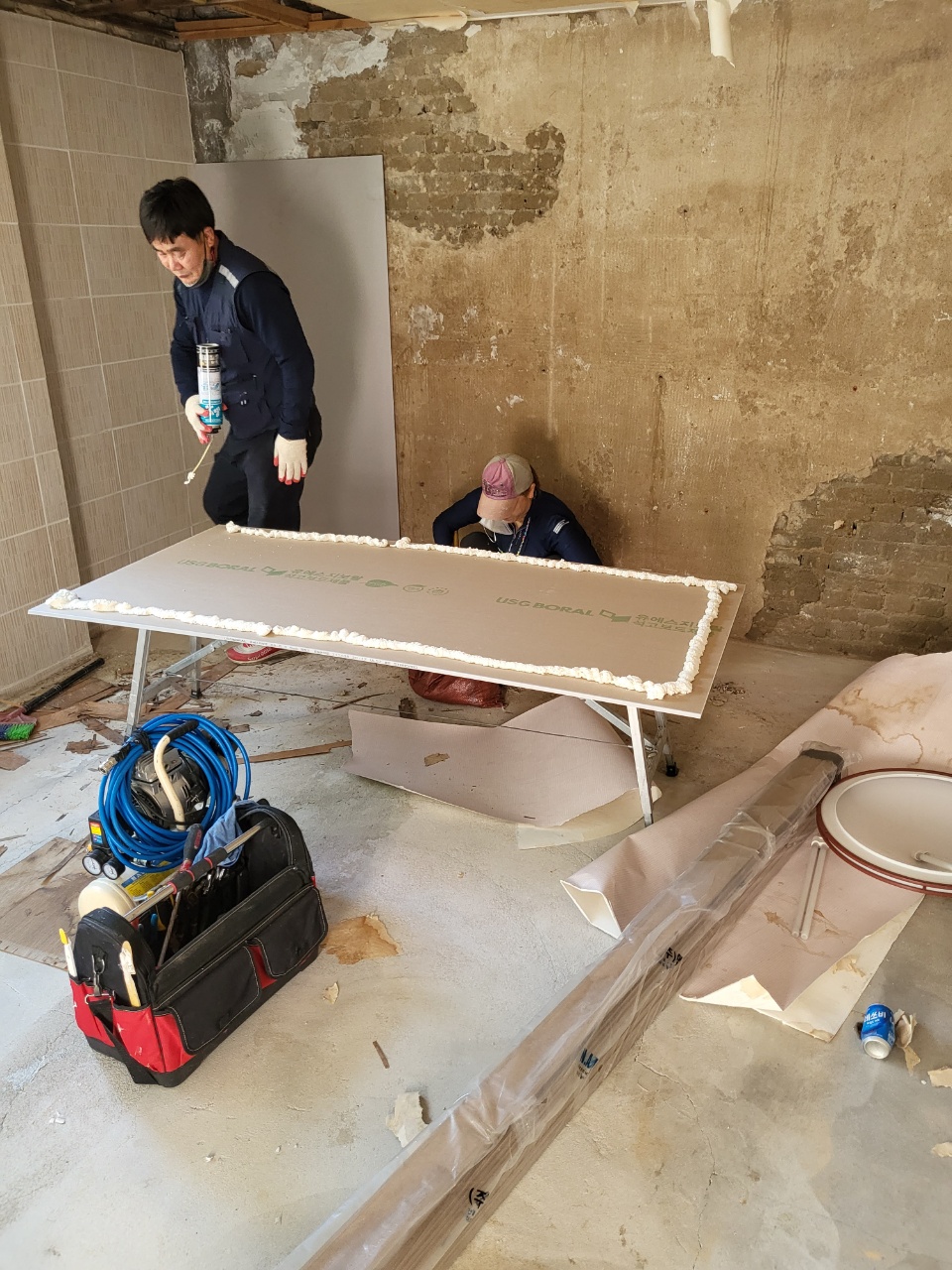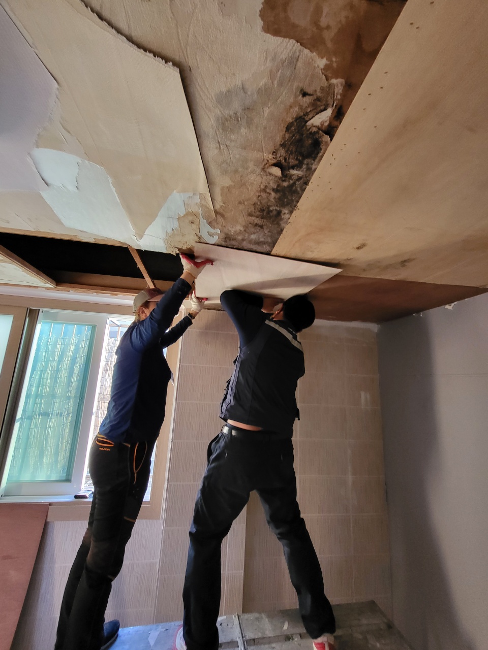 부산 남구에 위치한 문현동 아파트 누수 공사 후 복구를 위한 작업입니다. 복구공사는 대부분 천장 함석판 또는 석고보드의 곰팡이가 발생된 부분을 교체하는 작업 및 벽면의 곰팡이 부분 교체 또는 장판 등의 교체 작업이 많습니다. 누수 복구공사를 하면서 일부분 리모델링을 겸하기도 하는데요. 집을 한번 손보는 것이 쉽지는 않습니다. 집안의 물건을 빼내거나 복구작업 시 같이 병행을 하게 되면 비용도 절감하고 빠르게 작업할 수 있겠습니다. 문현동 아파트 누수 공사 후 복구작업까지는 많은 시간을 필요로 합니다. 도배공사를 하기까지는 벽면이나 천장이 마른 후 석고보드 교체 및 도배공사를 진행하는 것이 좋게 때문입니다. 간혹 빠르게 서둘러 요청을 하기도 하지만 또다시 곰팡이가 발생할 수 있기 때문에 충분히 마른 후 작업을 꼭 해야 하겠습니다.