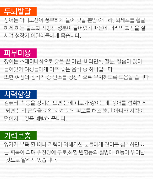 민물 장어 효능으로는 비타민 A성분이 만아서 오래전부터 민물장어의 효능이 증명되었고 보양식, 건강식으로 스테미너 식품으로 알려져 있습니다. 특히 장어는 여성에게도 좋아서 주름방지, 피부탄력유지. 성인병예방등으로 추천되고 있습니다. 소고기보다 좋다는 이유도 있죠. 그이유는 비타민 A의 성분이 소고기보다 몇십배 이상 축적되어 있다고 하니 결코 소고기를 부러워할 이유가 없습니다.