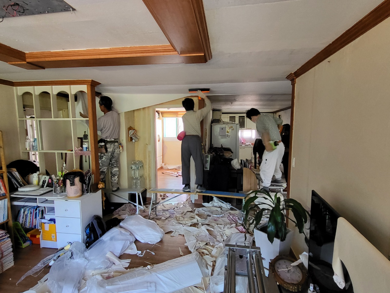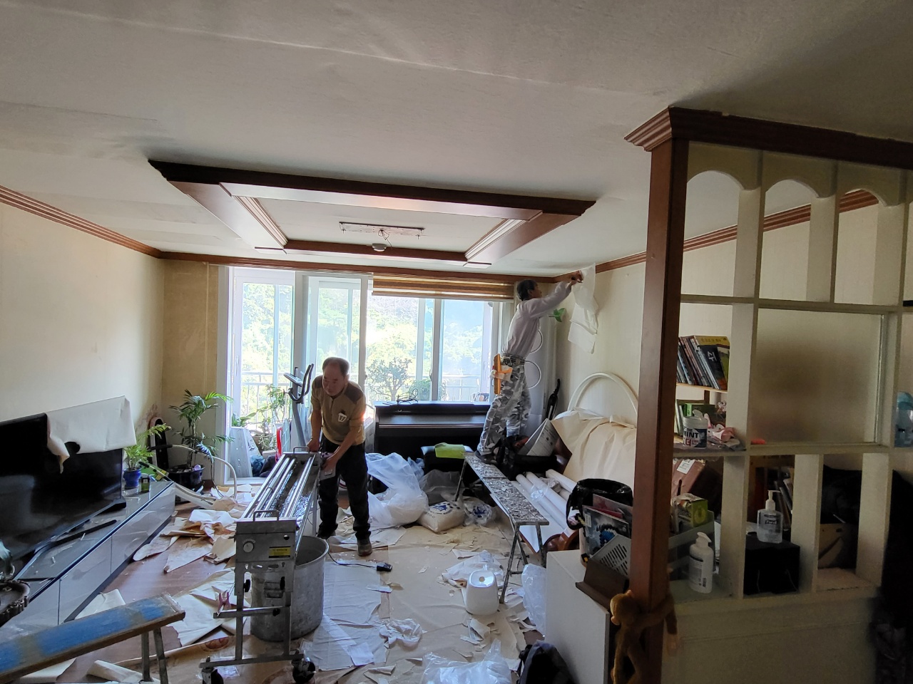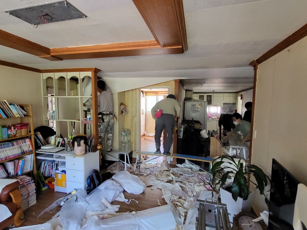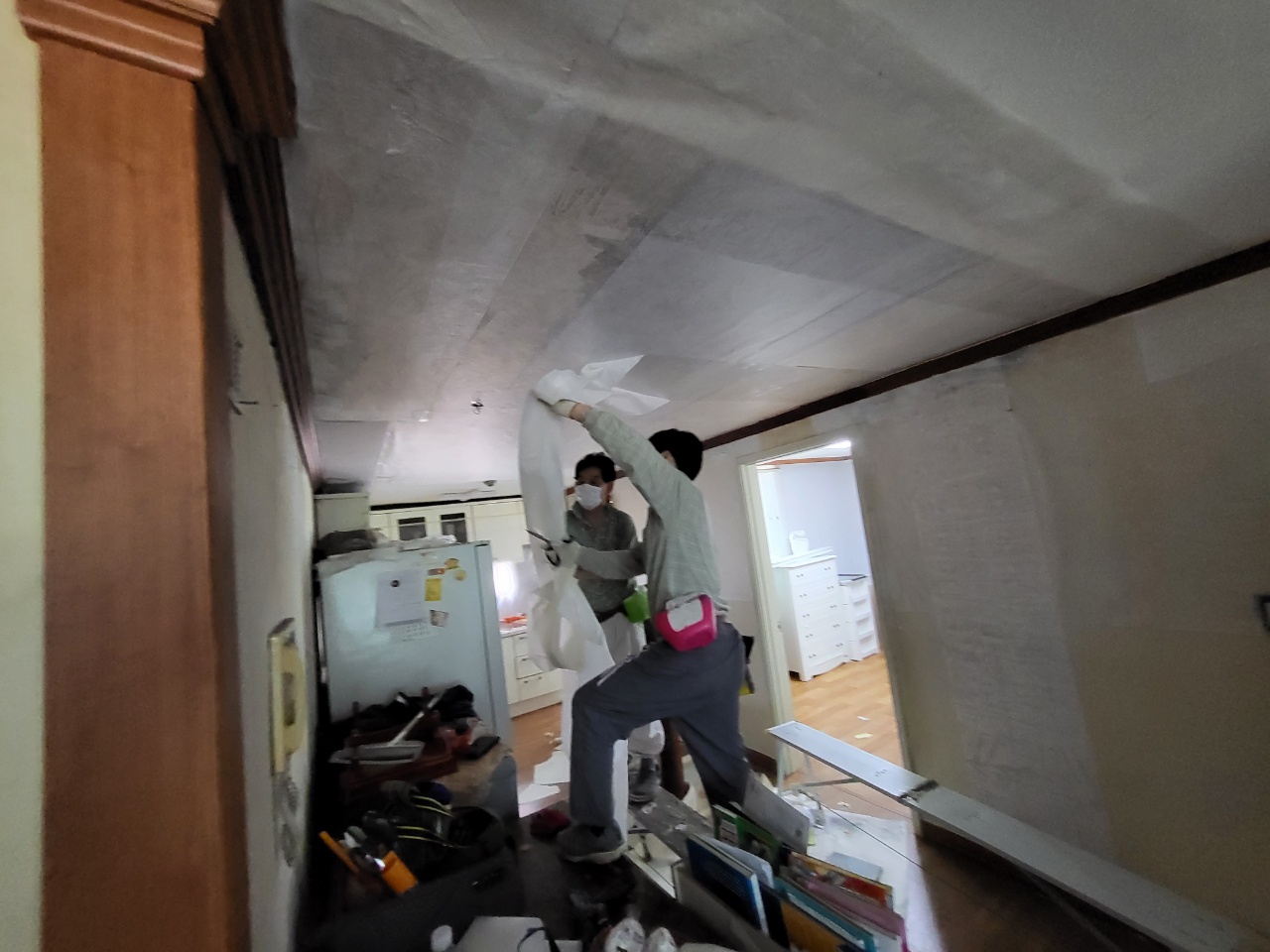누수된 부분이 제거가 완벽히 되지 않거나 곰팡이 균이 남아 있다면 도배 후 곰팡이가 다시 나오는 경우가 있습니다. 언제나 정직한 시공, 사후관리까지 진행을 하니 저희와 인연이 있는 고객님은 언제나 안심을 하십니다. 전문가의 작업으로 실크벽지를 고급스럽게 방 하나씩 작업을 끝내고 1인 작업, 2인 작업, 때로는 거실 천장의 긴 부분에는 3인 작업으로 빠르고 정확하게 마무리를 해드렸습니다. 거실과 주방, 작은방, 안방, 자녀방 등 완전히 깔끔한 집이 되었습니다. 도배 후 고생한 보람이 이 순간입니다. 세대주님도 도배 과정에서는 정말 매의 눈으로 보시다가 도배 마무리 후 깔끔한 집으로 탄생한 순간에는 미소가 나오는 순간입니다.