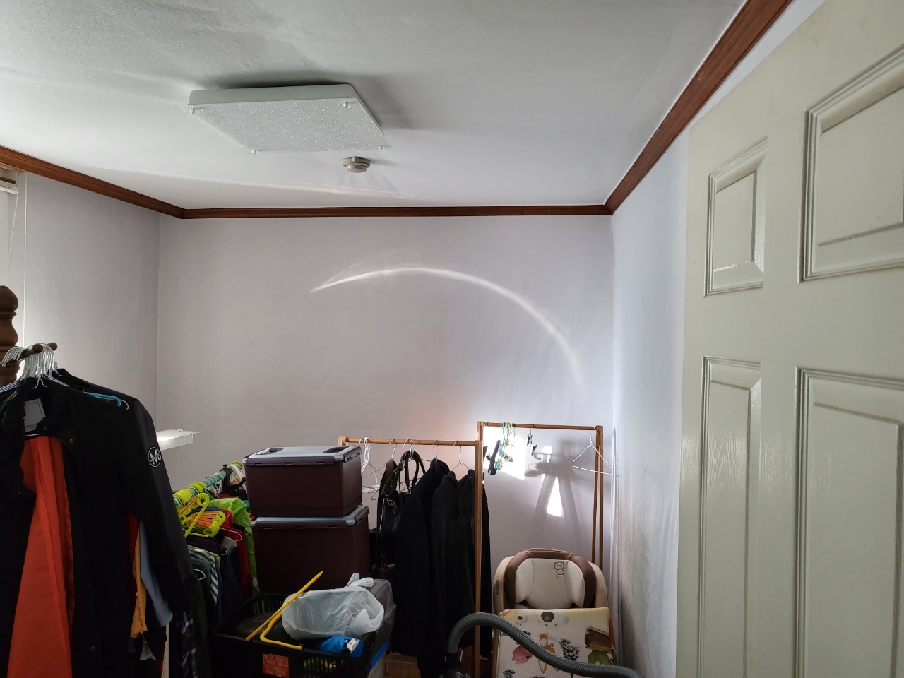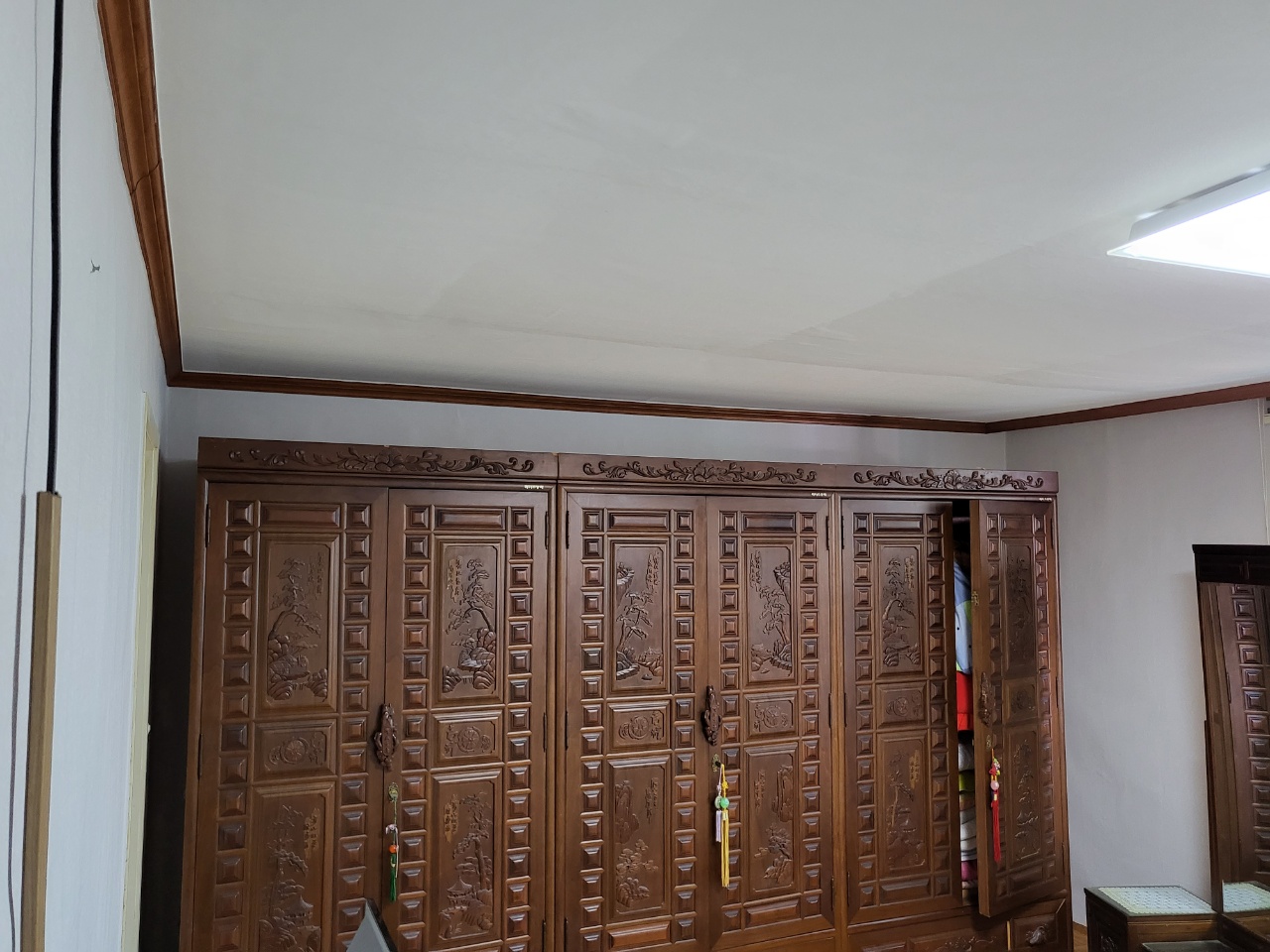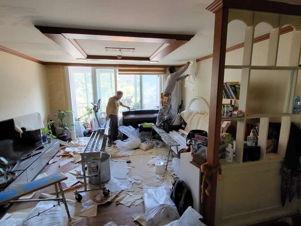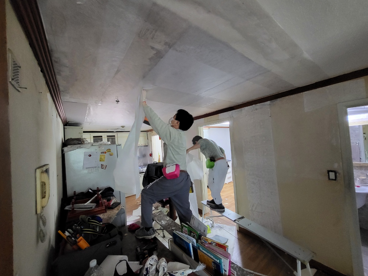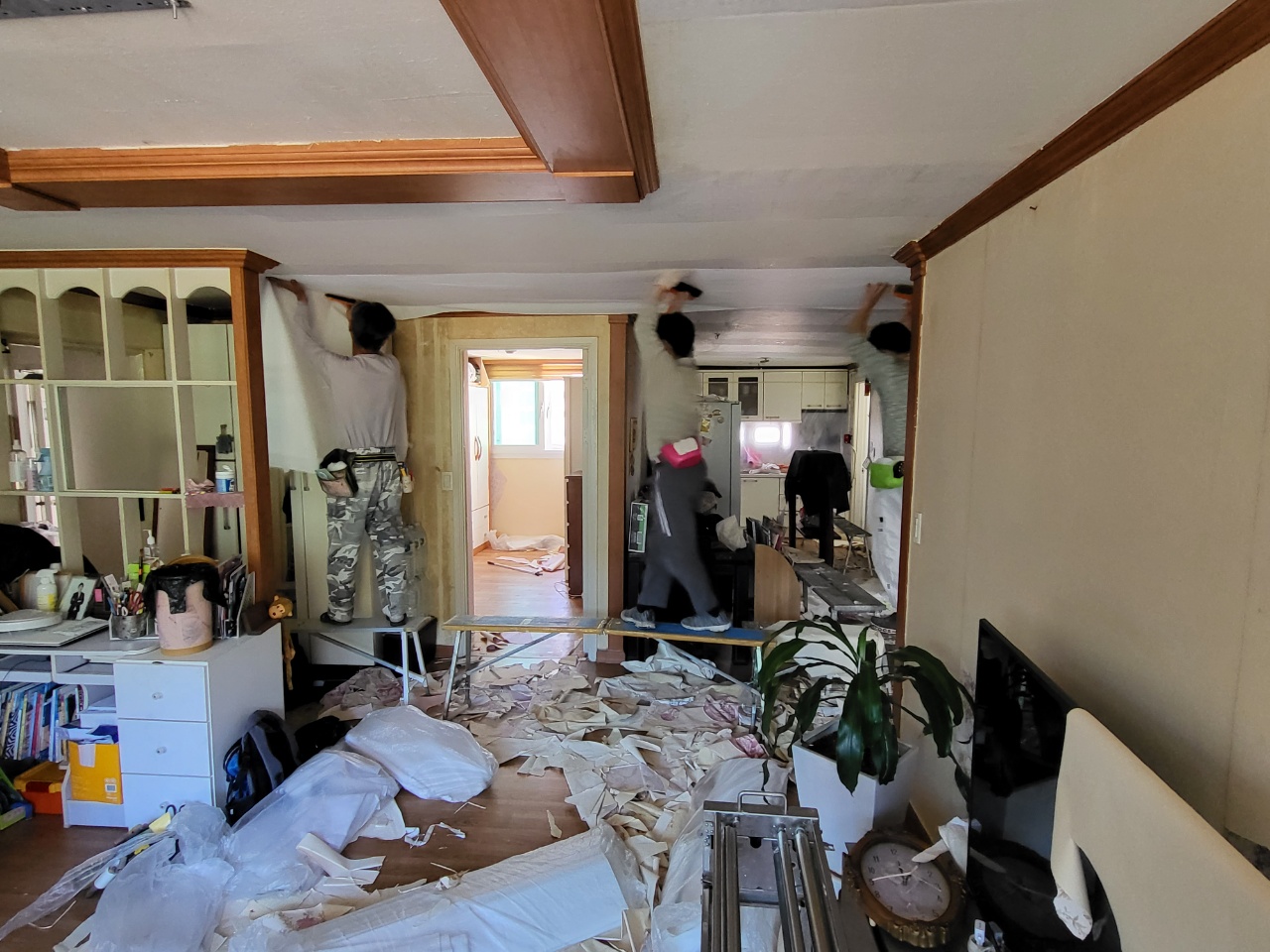 누수된 부분이 제거가 완벽히 되지 않거나 곰팡이 균이 남아 있다면 도배 후 곰팡이가 다시 나오는 경우가 있습니다. 언제나 정직한 시공, 사후관리까지 진행을 하니 저희와 인연이 있는 고객님은 언제나 안심을 하십니다. 전문가의 작업으로 실크벽지를 고급스럽게 방 하나씩 작업을 끝내고 1인 작업, 2인 작업, 때로는 거실 천장의 긴 부분에는 3인 작업으로 빠르고 정확하게 마무리를 해드렸습니다. 거실과 주방, 작은방, 안방, 자녀방 등 완전히 깔끔한 집이 되었습니다. 도배 후 고생한 보람이 이 순간입니다. 세대주님도 도배 과정에서는 정말 매의 눈으로 보시다가 도배 마무리 후 깔끔한 집으로 탄생한 순간에는 미소가 나오는 순간입니다.