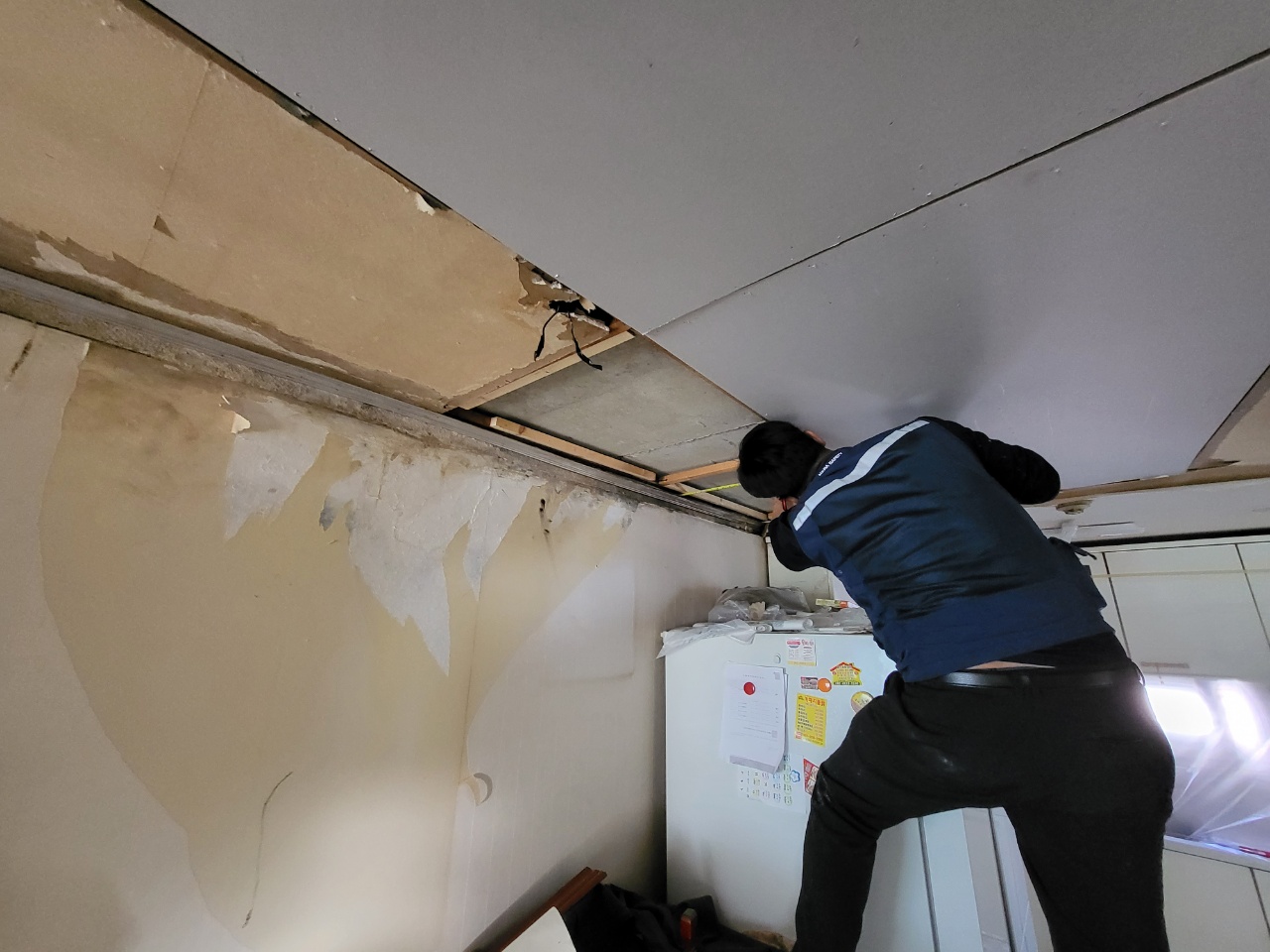 도배를 위해 누수된 부위 석고보드를 철거하고 곰팡이 있는 부분도 철거를 하고 깔끔하게 교체 작업은 첫 번째 우선 작업입니다. 자재를 아끼지 않고 충분히 필요한 만큼 조금이라도 문제 있는 부분이 석고보드 작업을 진행하였습니다. 모르는 분들은 대충 철거도 하지 않고 진행되는 부분이 있지만 저희 예가 종합 설비에서는 모든 것을 알려드리고 작업을 해드리고 보험처리가 되는 세대주분들에게는 완벽하게 진행과정을 사진 찍고 마무리해드립니다.