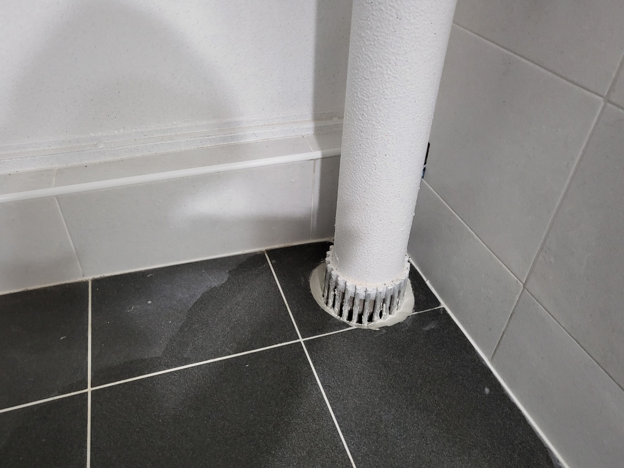 우수관 공용배관의 아래 타일 안쪽으로 방수층이 깨져 작업을 진행하였습니다. 먼저 완성된 모습을 보았는데요.